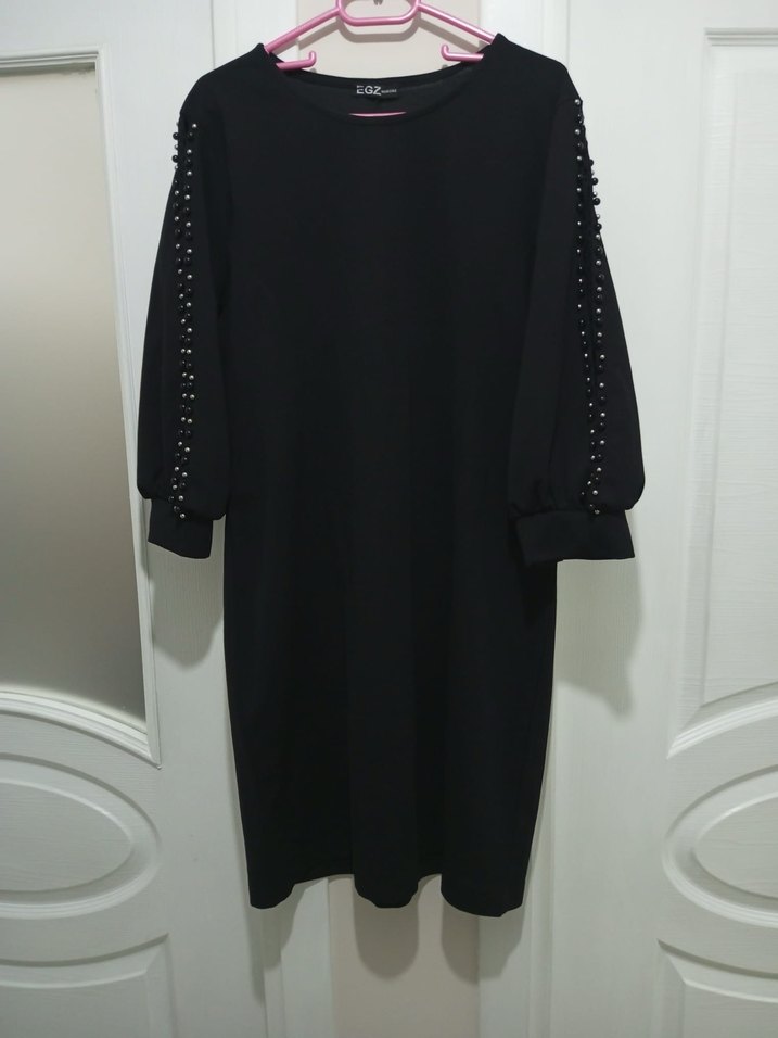Uzun siyah triko elbise, düğmeli uzun kollu, yuvarlak yaka ve bol kesimdir. Sentetik kumaştan yapılmış, gotik tarzda günlük kullanıma uygundur.