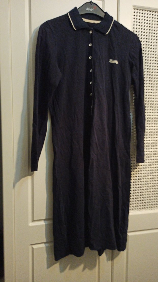 Pamuklu, siyah, uzun kollu, düğmeli ve yakalı bu triko elbise, ofis için uygun, goth tarzında şık bir seçim.