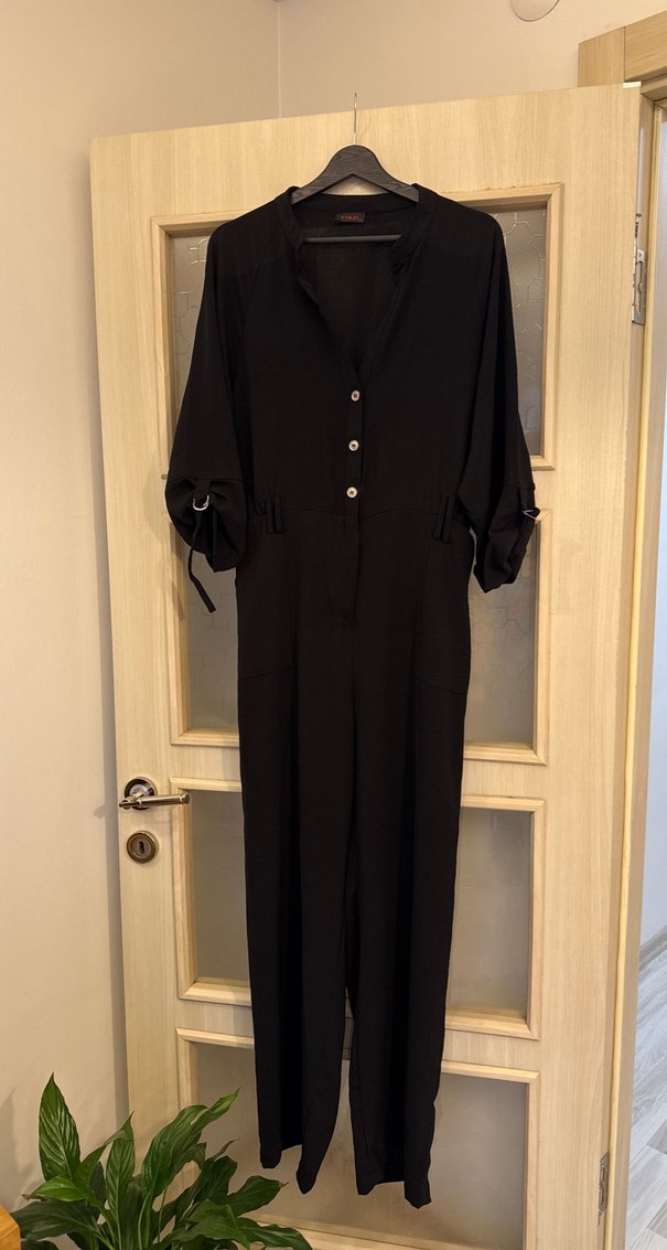 Siyah, uzun kollu, düğmeli ve yakalı, ofis için klasik ve şık bir kadın tulumu.