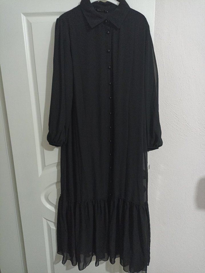 Siyah, uzun kollu, yüksek yakalı ve düğmeli bu uzun elbise, bol kesimiyle rahat bir görünüm sunar. şifon kumaştan yapılmıştır 44 48 bedene uyumlu