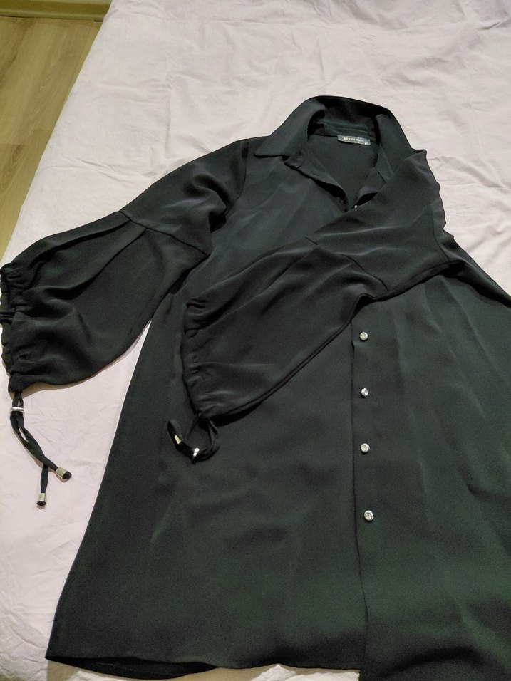 Siyah renkte, uzun kollu, düğmeli ve yakalı sık tunik. İpeksi kumaştan, bol kesim ve gotik tarzda, şık bir görünüm sağlar.