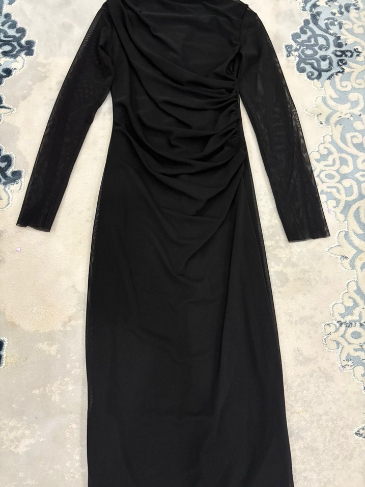 Drapeli ve uzun kollu, yüksek yakalı siyah gotik tarzda ince oturan uzun elbise. Düğünler için uygun, sentetik kumaştan yapılmıştır. M beden 1 kere giyildi