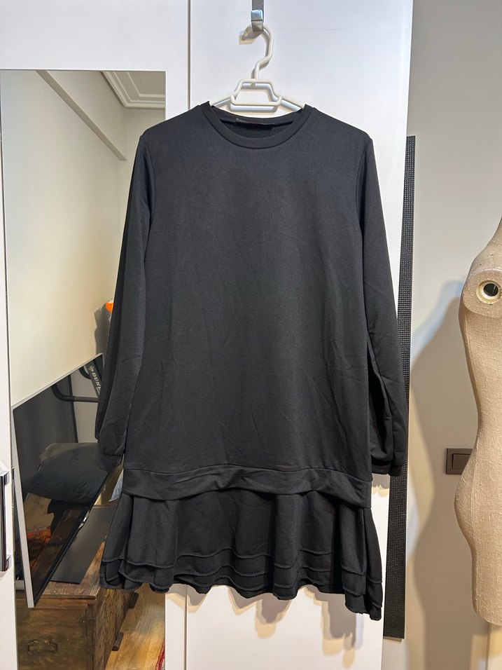 Siyah renk, uzun kollu, volan detaylı günlük elbise. Rahat kesimi ile günlük kullanım için idealdir. Etiketsiz sıfır üründür İki kol arası 49 boy 88 cm