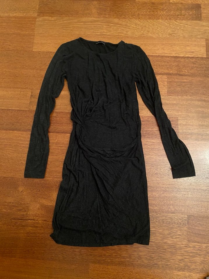 Siyah, uzun kollu, kruvaze yaka ve drapeli detaylara sahip dar kesim elbise