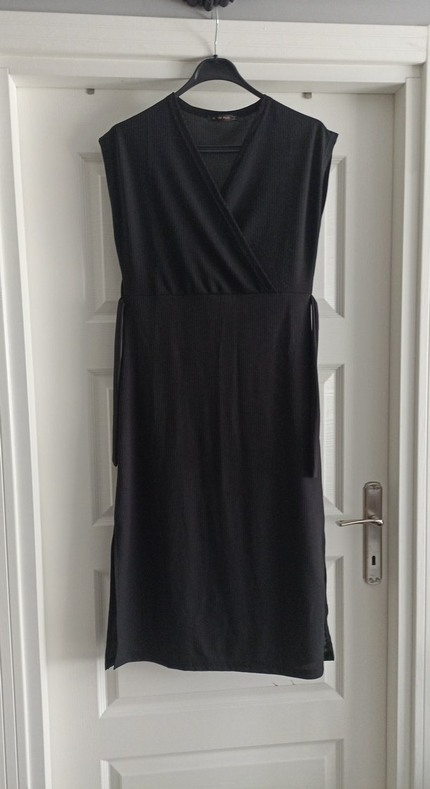 Kolsuz, V yakalı, drapeli siyah elbise Pürüzsüz sentetik kumaştan yapılmış ölçüleri, boy 117 iki kol arası 48, bel 40 cm