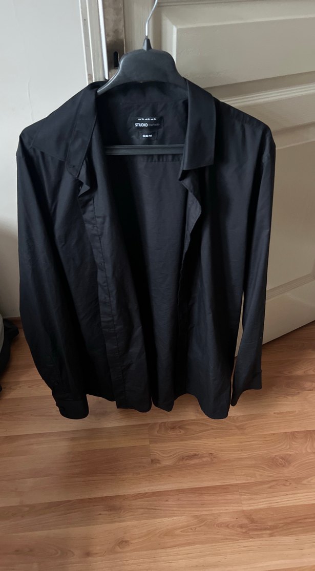Siyah, uzun kollu, kesik yakalı ve düğmeli erkek gömleği. İpek gibi kumaştan, normal kesim ve ofis kullanımı için uygundur.