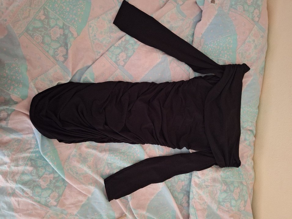 Drapeli, uzun kollu ve yüksek yakalı siyah elbise, sentetik kumaştan ve vücuda oturan kesimde tasarlanmıştır. Avant-garde goth tarzı yansıtır. madonna yaka esnek kumaş