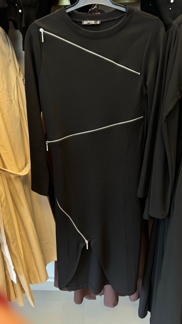 Ürünler sıfır etiketli butiğime aittir Siyah, uzun kollu, vücuda oturan elbise, sentetik kumaştan, çapraz fermuar detayları ve yuvarlak yaka.