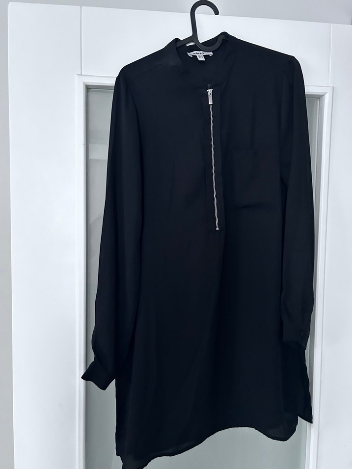 Siyah, uzun kollu, fermuarlı, yüksek yakalı kadın tunik. Gevşek kesim ve ipeksi kumaştan üretilmiştir. Minimalist goth tarzıyla ofis için uygundur.