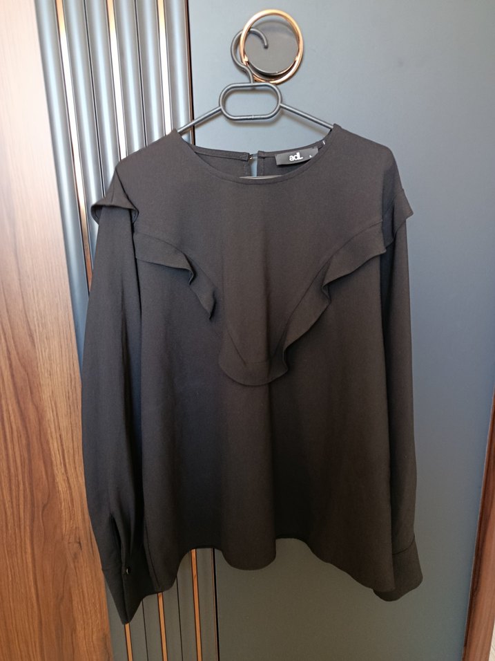 Siyah uzun kollu, yuvarlak yakalı ve fırfırlı detaylara sahip, rahat kesim günlük kullanıma uygun bluz. Ofis kullanıma uygundur. Rengi koyu siyah resimde daha açık duruyor sadece