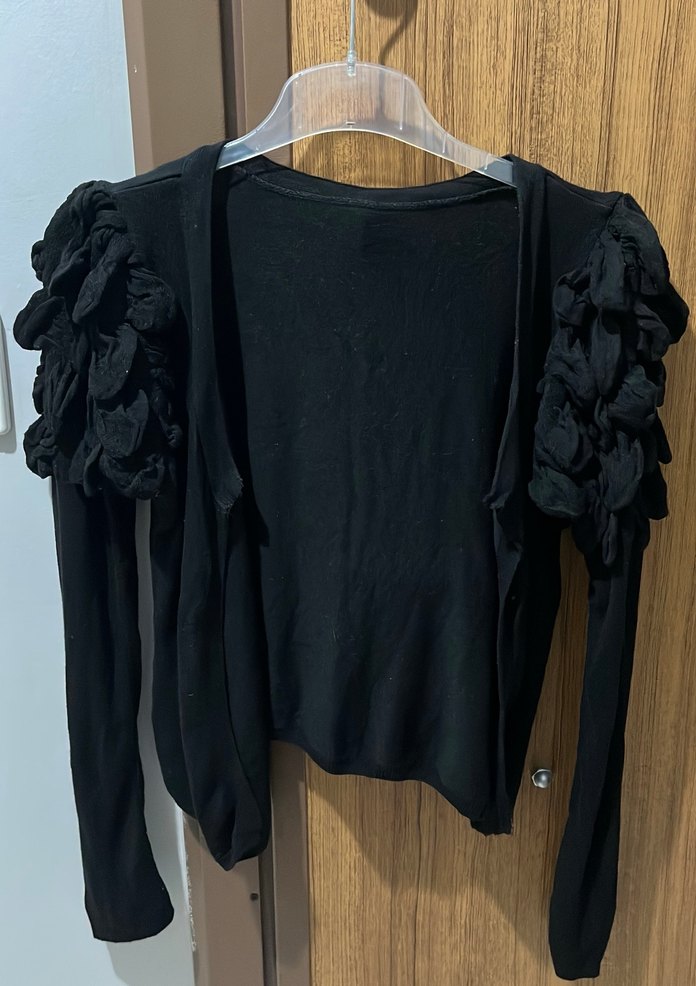 Siyah, uzun kollu, fırfırlı detaylara sahip, yuvarlak yakalı, dar kesim bolero. Yumuşak örme kumaştan yapılmıştır