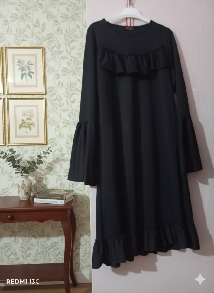Sentetik kumaştan, uzun kollu, fırfırlı detaylı, kayık yaka ve bol kesim siyah elbise. Günlük kullanıma uygun, mütevazı gotik tarz.