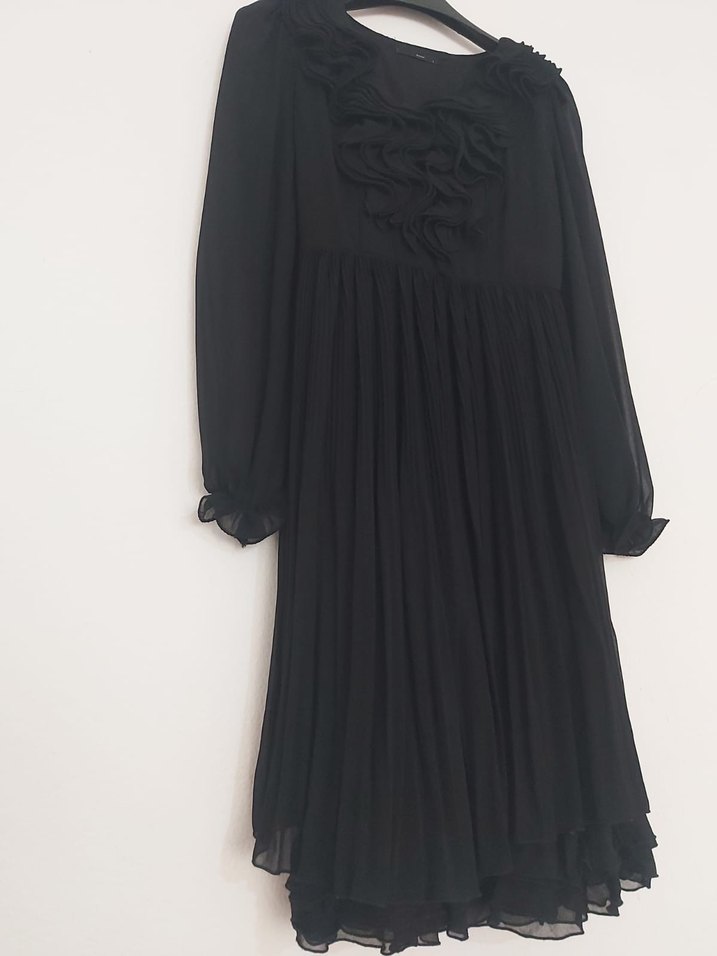 Siyah uzun kollu elbise, yüksek yakalı ve fırfır detaylıdır. İpeksi kumaştan, bol kesimlidir. Gotik ve bohem tarzlara uygundur, düğün için ideal.