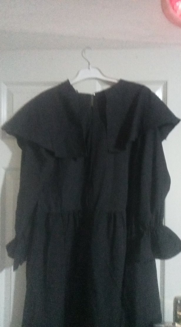 Siyah renkli, keten kumaştan uzun kollu, fırfırlı ve yakalı kadın elbisesi. Gevşek kesim ve gotik tarzda, günlük kullanım için uygundur.