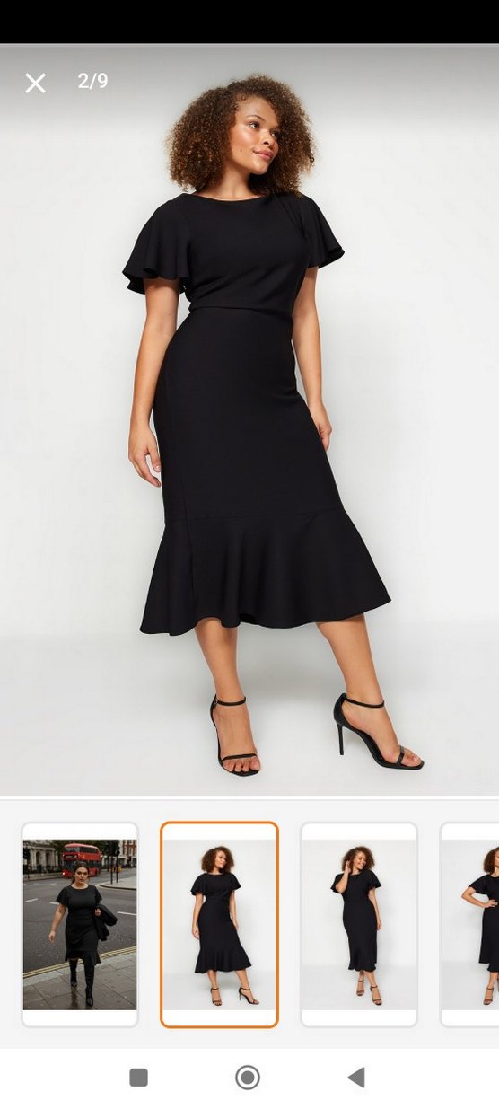 Bu siyah uzun kalem elbise, V yaka ve fırfır detaylara sahiptir. Pürüzsüz sentetik kumaştan üretilmiş, askılı kolları ve regular kesimiyle çağdaş ve cesur bir görünüm sunar.