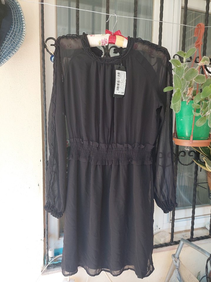 Siyah midi elbise, uzun kollu ve yuvarlak yakalıdır. Fırfır detayları ve bol kesimiyle rahat bir kullanım sunar.