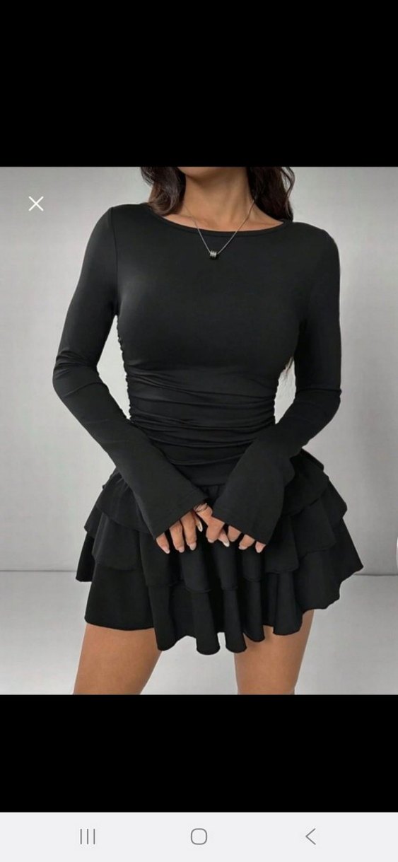 Siyah uzun kollu, fırfırlı ve dar kesim mini elbise. Yuvarlak yaka ve günlük kullanıma uygun sentetik kumaştan üretilmiştir.