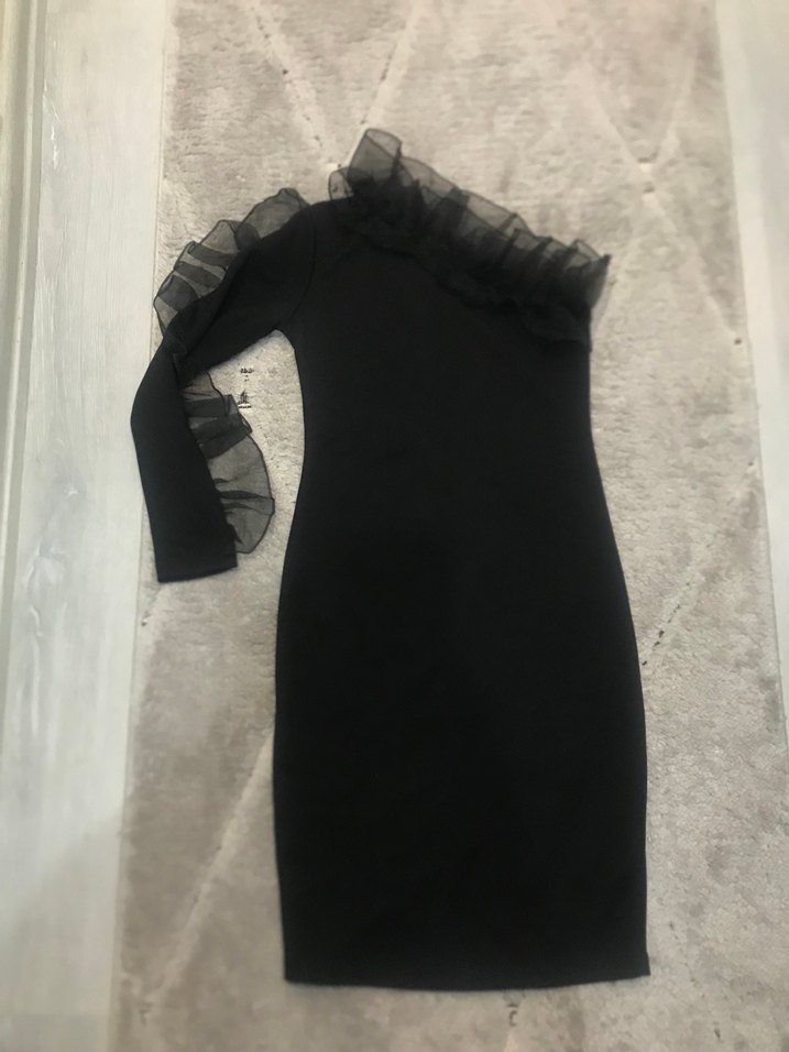Siyah Uzun Kollu Fırfırlı Straplez Elbise