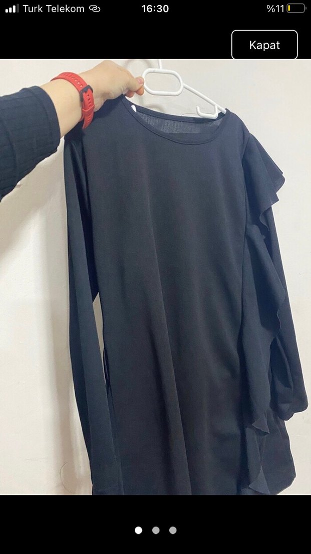 Siyah, uzun kollu, yuvarlak yaka takım Salaş kesim, fırfır detaylı. Pürüzsüz sentetik kumaştan, günlük kullanıma uygun.