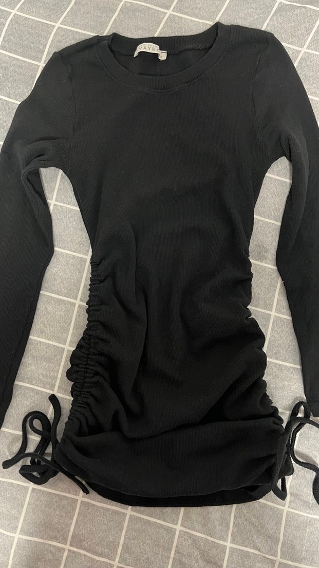 Siyah, uzun kollu, yüksek yakalı ve yanlarda fırfır detaylı dar kesim midi triko elbisedir. Günlük rahat kullanım için uygundur. STANDART beden