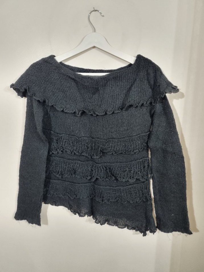 Siyah renkli, uzun kollu ve tekne yaka olan bu triko kazak, fırfır detaylarına sahiptir. Rahat kesimi ve kısa boyu ile gündelik kullanıma uygundur.