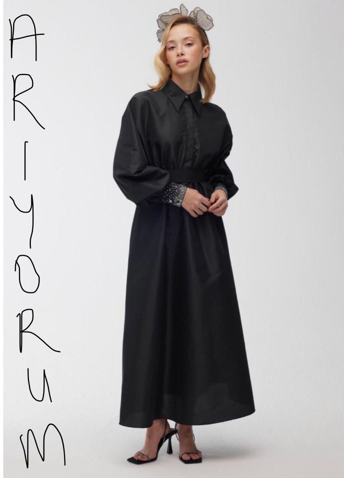 Siyah uzun kollu, geniş kesim ve yakalı uzun elbise. İpeksi kumaştan, ofis için uygun gotik tarzda, zahmetsiz şıklık sunar.