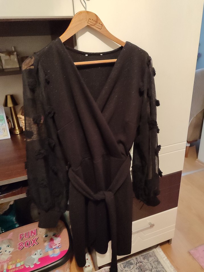 Siyah, gevşek kesim midi sabahlık, uzun kollu ve dokulu detaylara sahip. Belde kuşaklı, rahat ve gotik tarzda bir parça. FUN yazısı görünüyor.