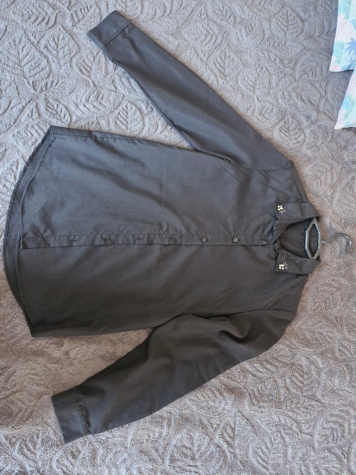 siyah renkte, yakalı ve düğmeli uzun kollu gömleği. Düz ve sentetik kumaştan, günlük rahat sokak stili için uygun. hic giyilmedi simsiyah rengi hic bir sorunu yok