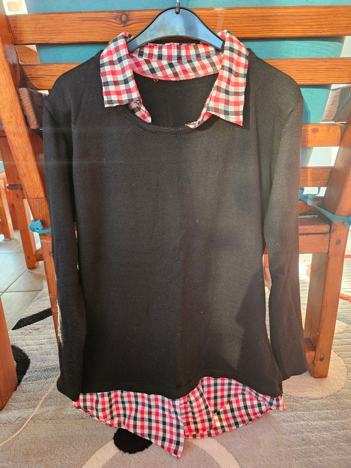 Siyah, uzun kollu, gömlek detaylı triko. Rahat kesim, kareli iç yakası ve eteğiyle gotik tarzda, konforlu bir model.