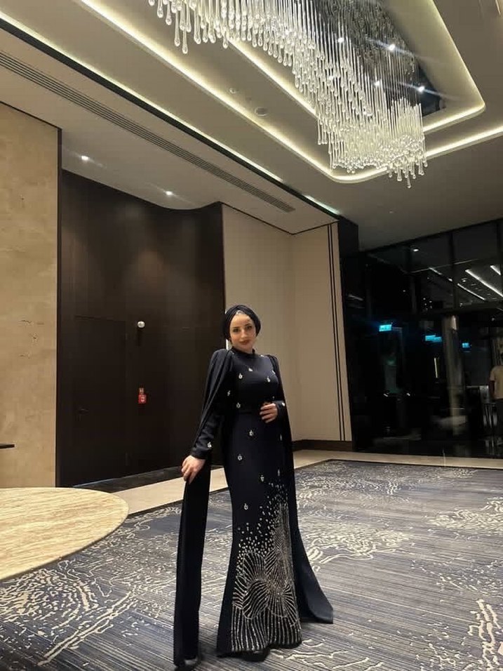 Uzun, regular kesim siyah abiye elbise, uzun kollu ve yakası notched lapel. Drapeli tasarım ve desenli detaylar içerir, düğün için uygundur. kiralık bone dahil