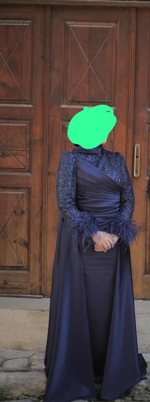 Lacivert uzun kollu, tüy detaylı manşetlere ve yüksek yakaya sahip, drapeli ve vücuda oturan gotik abiye elbise. Pınar Şems abiye gece mavisi 46 beden, boy 2 metre pelerinli elbise. Söz ve nişanda giyilir yalnızca bir kere giyildi. 2 metre boyutunda olan şalı hediyedir
