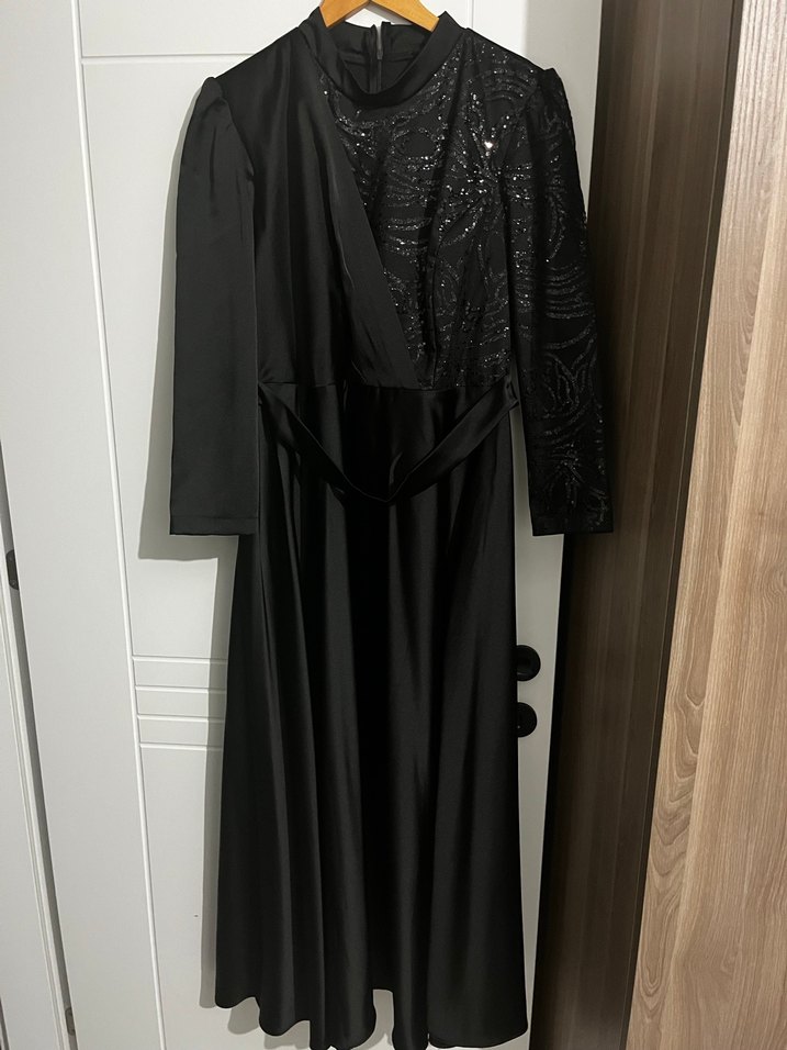 Siyah, uzun kollu, yüksek yakalı uzun elbise. Drapeli tasarım ve desenli detaylara sahip, düzenli kesimle mütevazı bir görünüm sunar. Şık abiye bir kere kullanıldı
