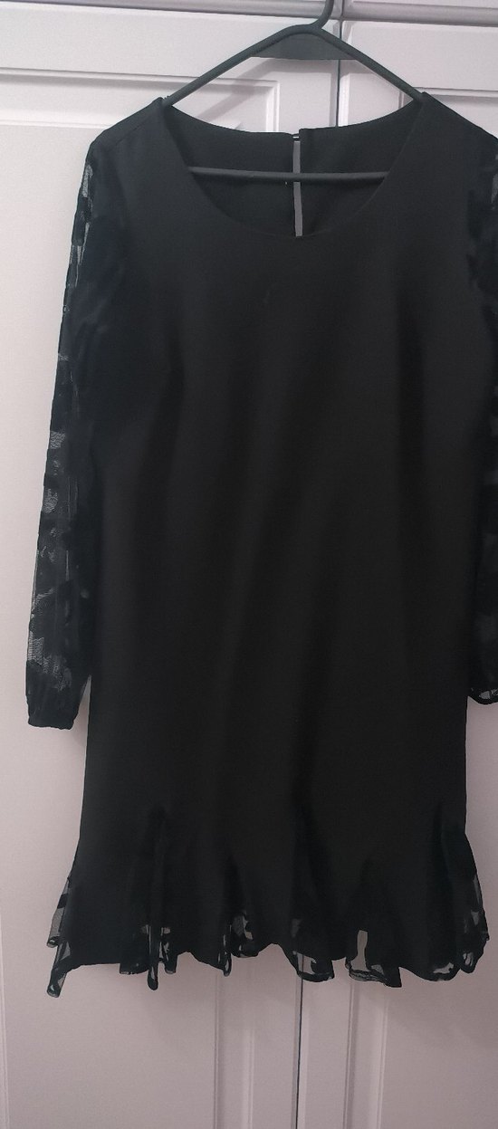 Siyah uzun kollu, fırfırlı ve bol kesimli gotik elbise, sentetik kumaştan, yuvarlak yakalıdır.