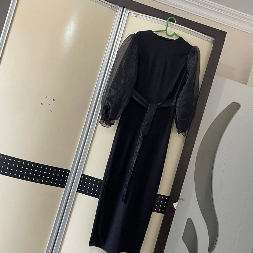 Siyah uzun elbise, yüksek yakalı ve şeffaf uzun kollara sahip. Belinde kemer bulunur, sentetik kumaştan yapılmıştır. Günlük kullanım için uygundur ve gotik tarzdadır.
