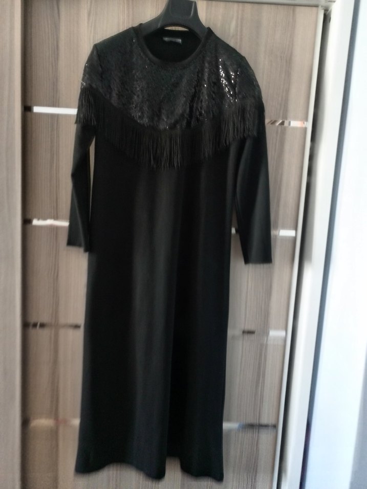 Bu siyah uzun elbise, uzun kollu ve bisiklet yakalıdır. Yumuşak sentetik kumaştan drapeli tasarıma sahiptir. Düzenli kesim ve sade gotik tarzda, günlük kullanıma uygundur.