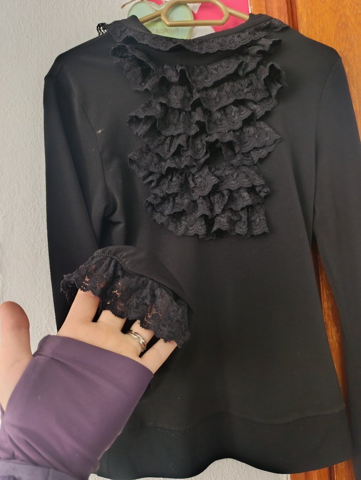 Bu siyah, dar kesim bluz, boğazlı ve uzun kolludur, ön ve kol manşetlerinde dantel fırfır detayları bulunur, yumuşak sentetik kumaştandır.