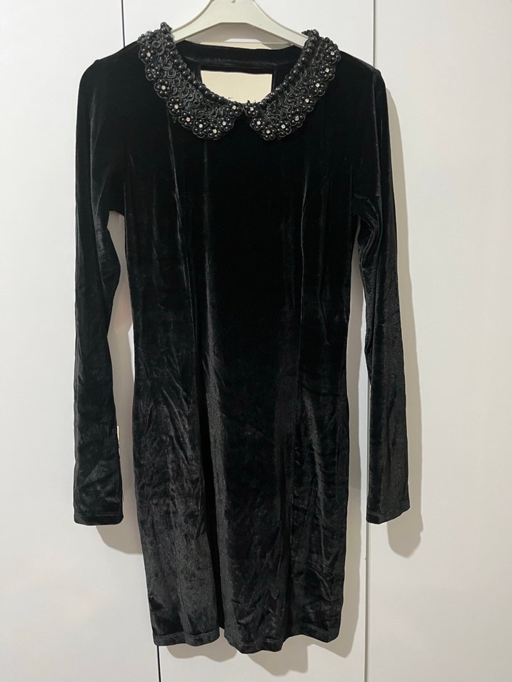 Siyah kadife kumaştan, uzun kollu, yakası payetli ve dar kesim gotik elbise, romantik akşamlar için uygun şık bir tercihtir.