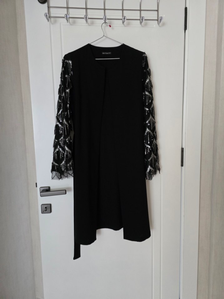 Siyah uzun kollu, drapeli ve detaylı kolları olan uzun ceket. Gotik ve avangart tarzlara uygundur.