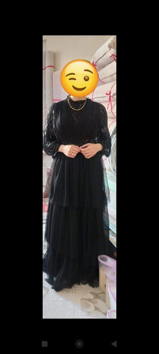 Siyah renkli, yüksek yakalı ve uzun kollu, desenli, bol kesim, drapeli uzun abiye elbise. Gotik tarzda, mütevazı ve düğün için uygun. kenarda hafif bı tüylenme mevcut belli bile olmuyor
