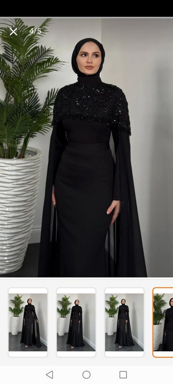 Bu siyah, uzun kollu ve yüksek yakalı abiye elbise, drapeli ve boncuklu kısa pelerin detayına sahiptir. Gotik tarzıyla şık düğünler için uygundur. sadece bir kere kullanılmıştır