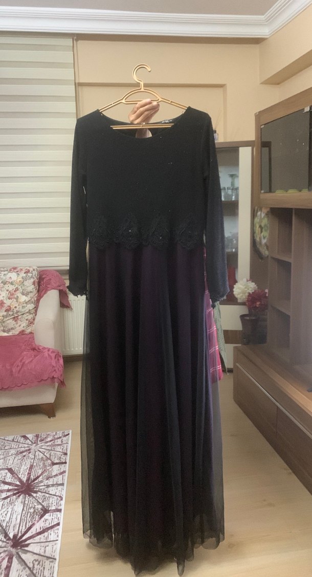 Siyah uzun kollu, bol kesim ve drapeli detaylara sahip gotik tarzda klasik şıklıkta kadın abiye elbisesi. Yuvarlak yakalı, düğün için uygun.