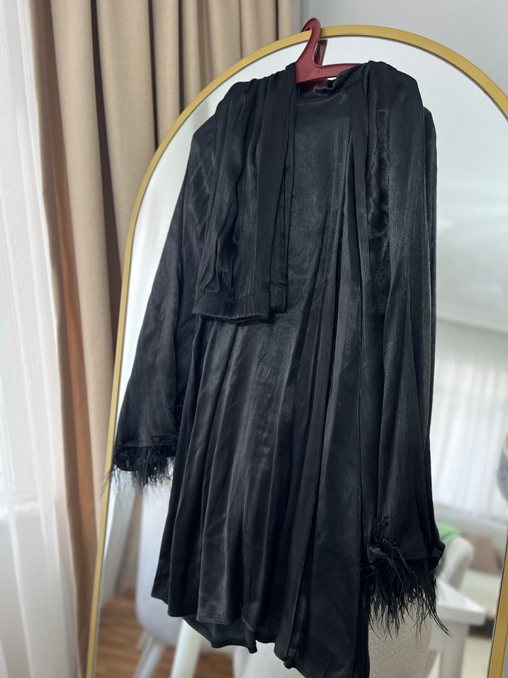 Siyah, uzun kollu ve tüy detaylı manşetlere sahip, bol kesim uzun boy sabahlık. Gotik tarzı yansıtan yumuşak ve akışkan kumaş.