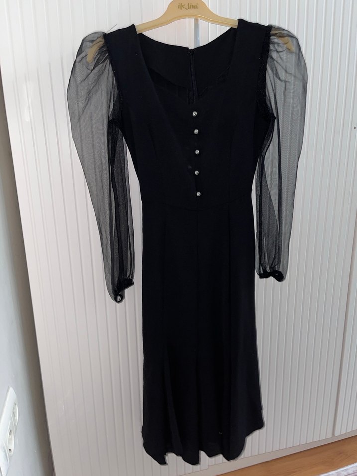 Siyah, uzun kollu ve düğmeli ön yüzü olan vücuda oturan uzun elbise. Şeffaf kolları ve ipeksi dokusuyla gotik tarzda ofis kullanımı için uygun.