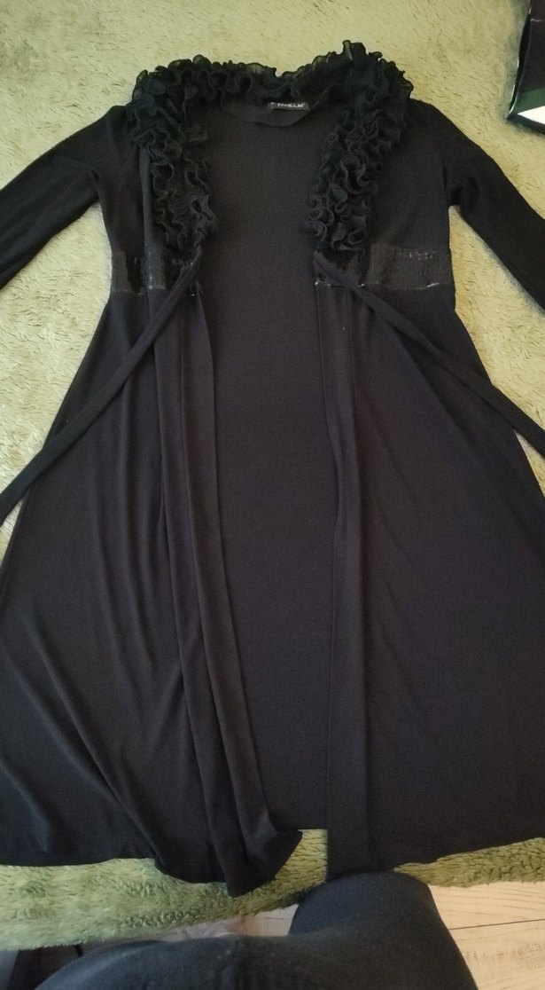 Siyah, uzun kollu ve uzun boylu, vücuda oturan gotik tarzda kadın elbisesi. Ön kısmında fırfır detayları bulunur, koyu ve şık bir görünüme sahiptir.