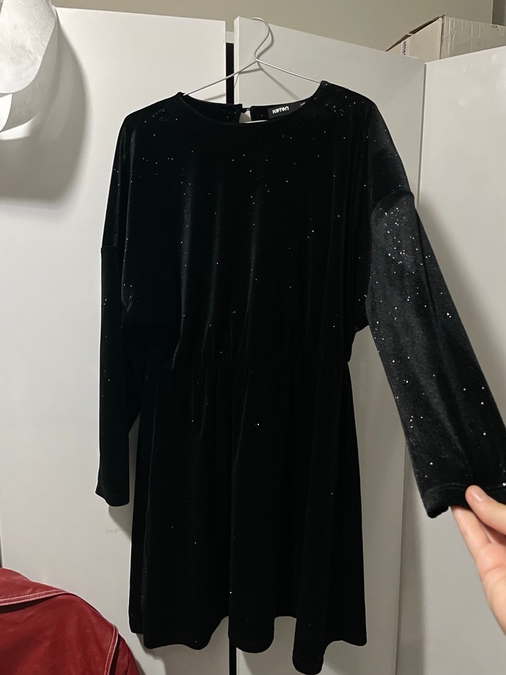 Siyah, uzun kollu, bol kesim ve drapeli kadın gece elbisesi. Yuvarlak yaka ve gotik tarzda, ofis için uygun.