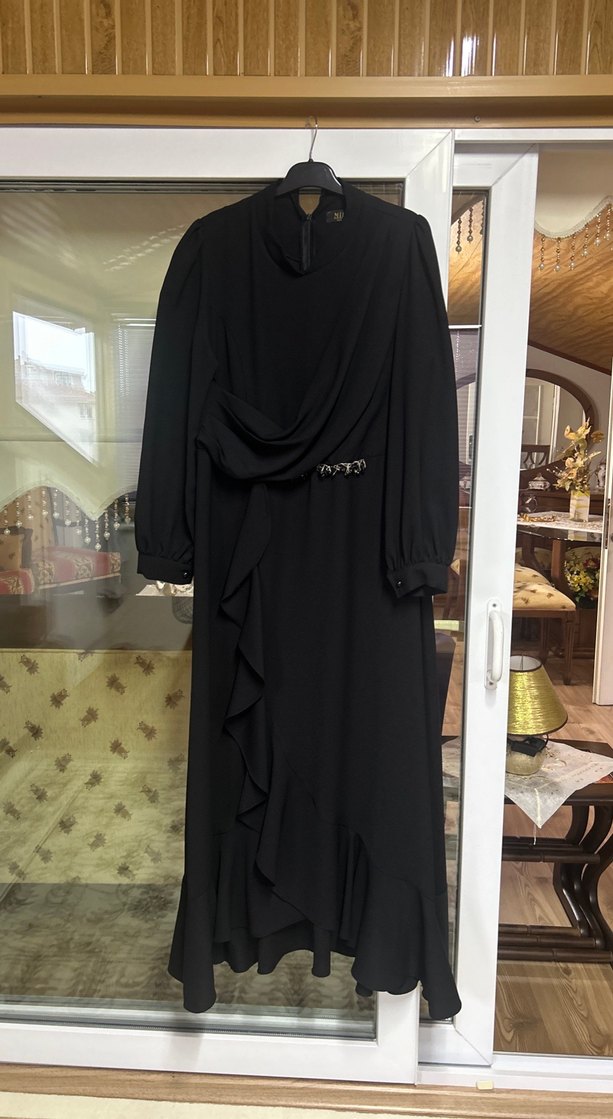 Siyah uzun kollu, yüksek yakalı gotik kadın elbisesi. Bol kesim ve drapeli tasarıma sahip, hafif desenlidir ve ofis için uygundur.