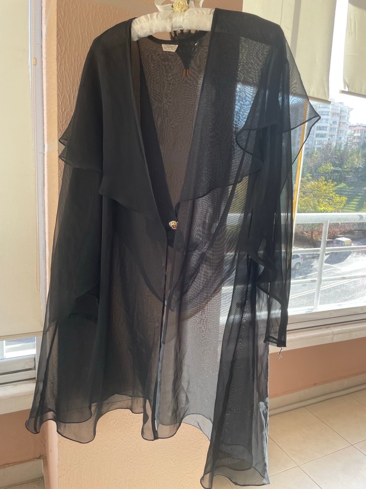 Siyah, uzun kollu, bol kesim, transparan hafif kumaştan yapılmış gotik tarzda kadın elbisesi. Desensiz ve uzun boydadır.