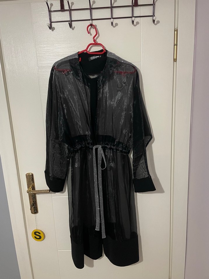 Siyah, uzun kollu, şeffaf kumaştan, bol kesim ve bel kısmında ayarlanabilir ip detaylı gotik tarzda kadın elbisesi.