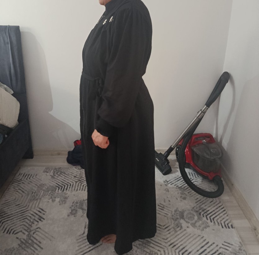 Siyah uzun kollu, yakası kesimli ve salaş kesim gotik elbise. Yumuşak ve sıcak kumaştan, günlük kullanım için uygun.