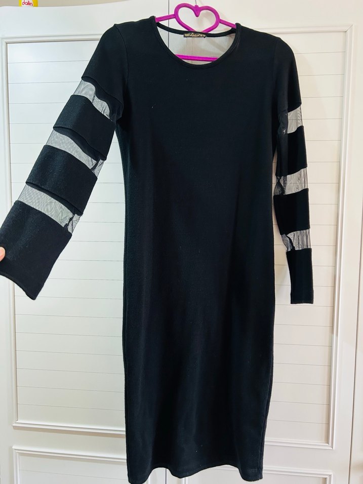 Siyah, uzun kollu, triko kumaştan yapılmış, dar kesim gotik tarzda elbise. Kollarında şeffaf çizgigünlük kullanıma uygundur.